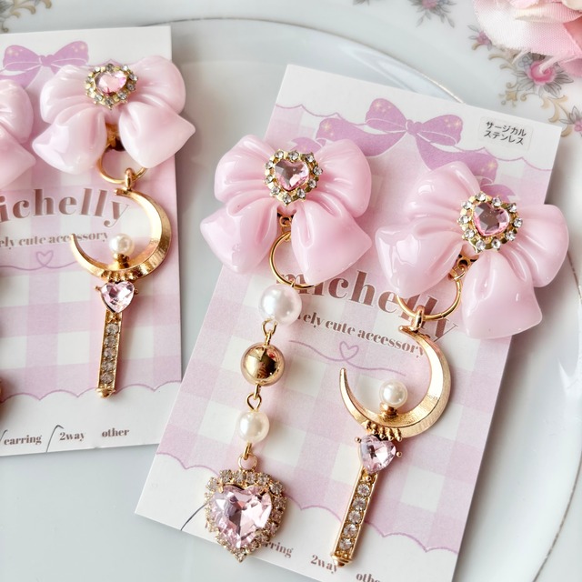 大きめのモチーフを組み合わせました! いつものカボションよりは少し大きめで、存在感アップです! スワロフスキーを使っており、キラキラ度高めですので主役になれちゃいます♡ もちろんパールリボンのセンターにもスワロフスキー!!! 髪の毛をアップされる方や耳にかける方、ショートやボブの方におすすめです♡ イヤリングのみ2way仕様となっており、チャームを取り外してもお使いいただけます。 ピアスはアレルギーの方にやさしいサージカルステンレス素材を使っております。
